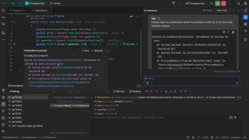 An exception stack trace appears in your console. Instead of Googling line by line, you paste it into the AI and get a step‑by‑step explanation of likely causes and fixes.
